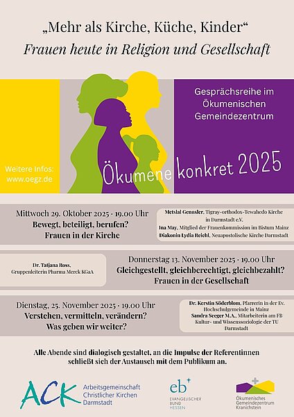 Die Reihe beginnt am Mittwoch, den 29. Oktober mit dem Thema „Bewegt, beteiligt, berufen? Frauen in der Kirche. Als Referentinnen werden Metslal Gennsler (Tigray-orthodox-Tewahedo Kirche in Darmstadt e.V), Ina May (Mitglied der Frauenkommission im Bistum Mainz) und Diakonin Lydia Reichel (Neuapostolische Kirche) berichten. Ein Podiumsgespräch und Publikumsfragen schließen sich an. Der Abend wird moderiert von der Pfarrerin für Ökumene und interreligiöses Gespräch im Dekanat Darmstadt Ilka Friedrich.